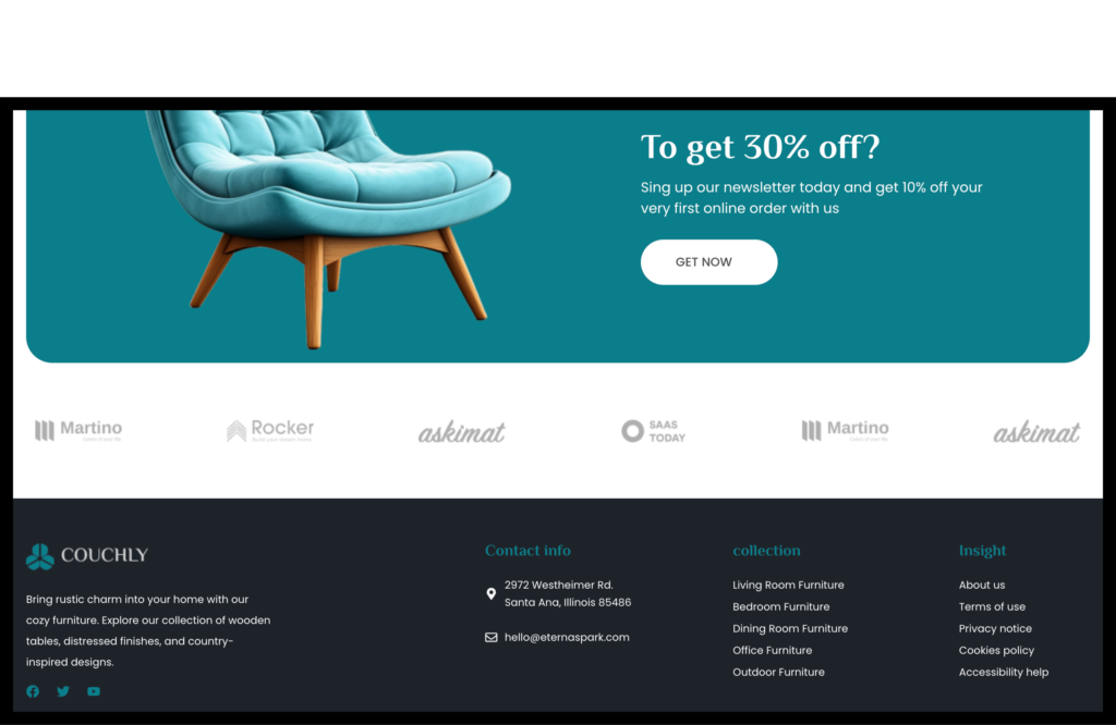 Working on Couchly took me careful planning โ€” choosing the right design blocks, placing menus, adding product lists, and making sure everything looked good on phone and computer. I also added newsletter sign-up, testimonials, and trust badges such as Free Shipping and Money Guarantee to build credibility.